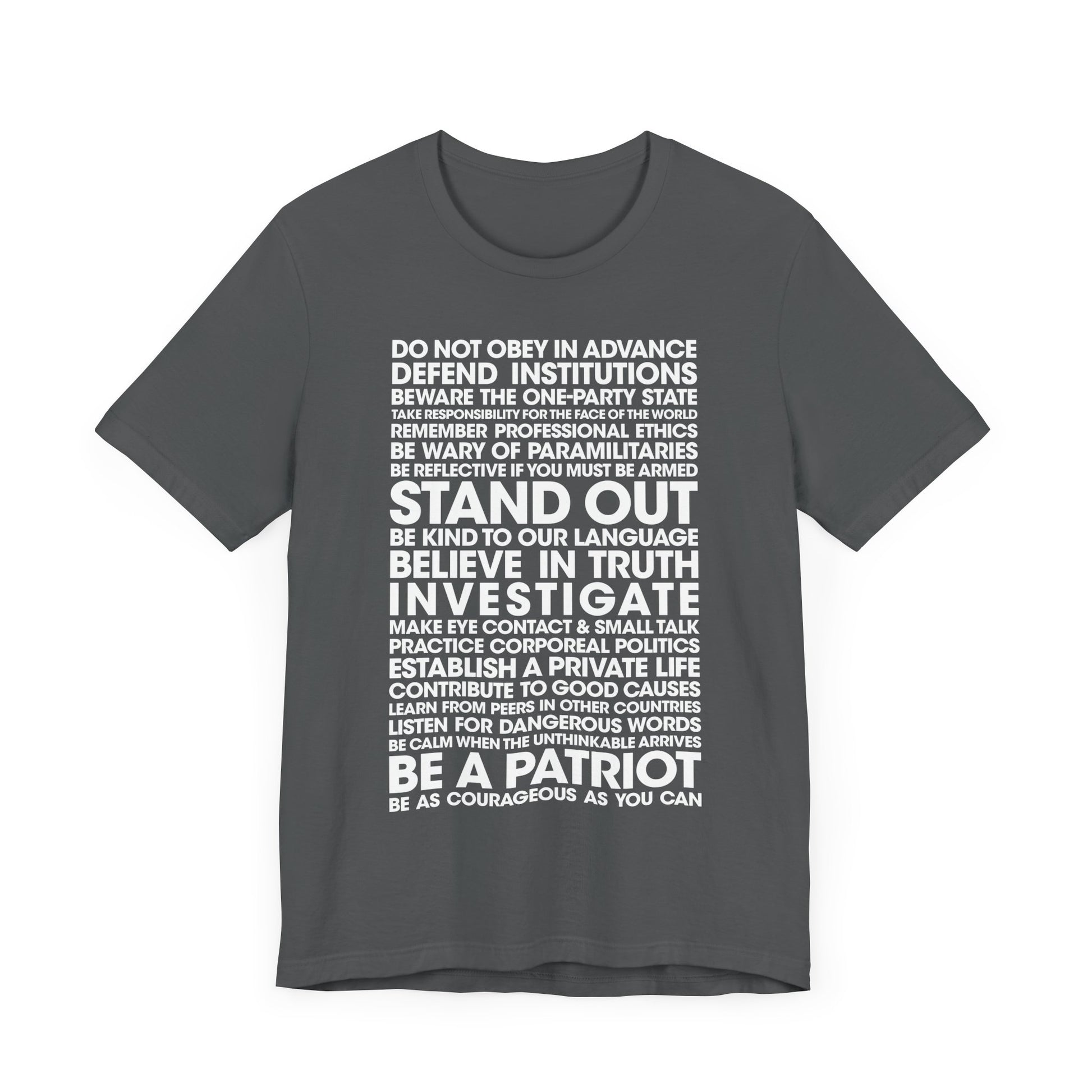 A shirt adaptation of the lessons from the book "On Tyranny: Twenty Lessons from the Twentieth Century" by Timothy Snyder. These ideas are more vital and necessary than ever, and this shirt will help broadcast the core concepts wherever you go.