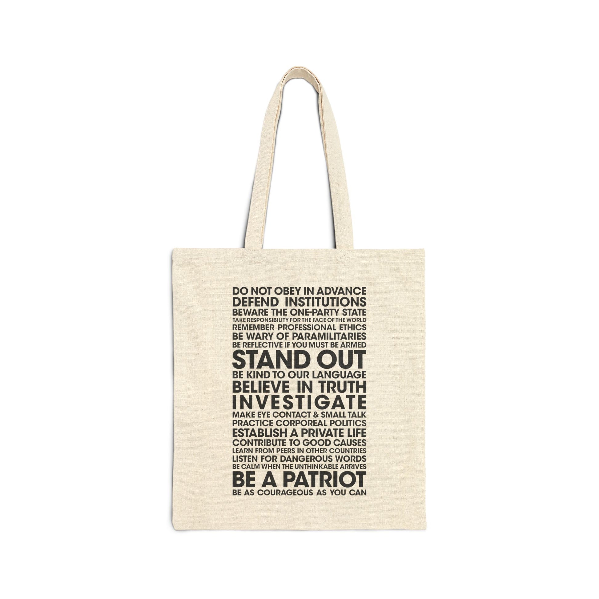 An adaptation of the lessons from the book "On Tyranny: Twenty Lessons from the Twentieth Century" by Timothy Snyder. These ideas are more vital and necessary than ever, and this tote bag will help broadcast the core concepts wherever you go.