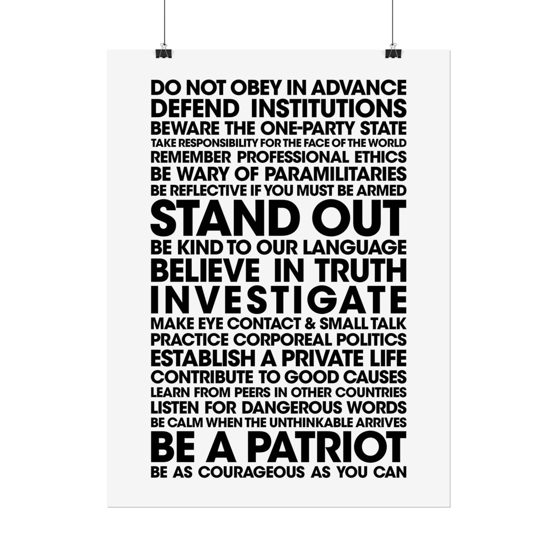 A poster adaptation of the lessons from "On Tyranny: Twenty Lessons from the Twentieth Century" by Timothy Snyder.