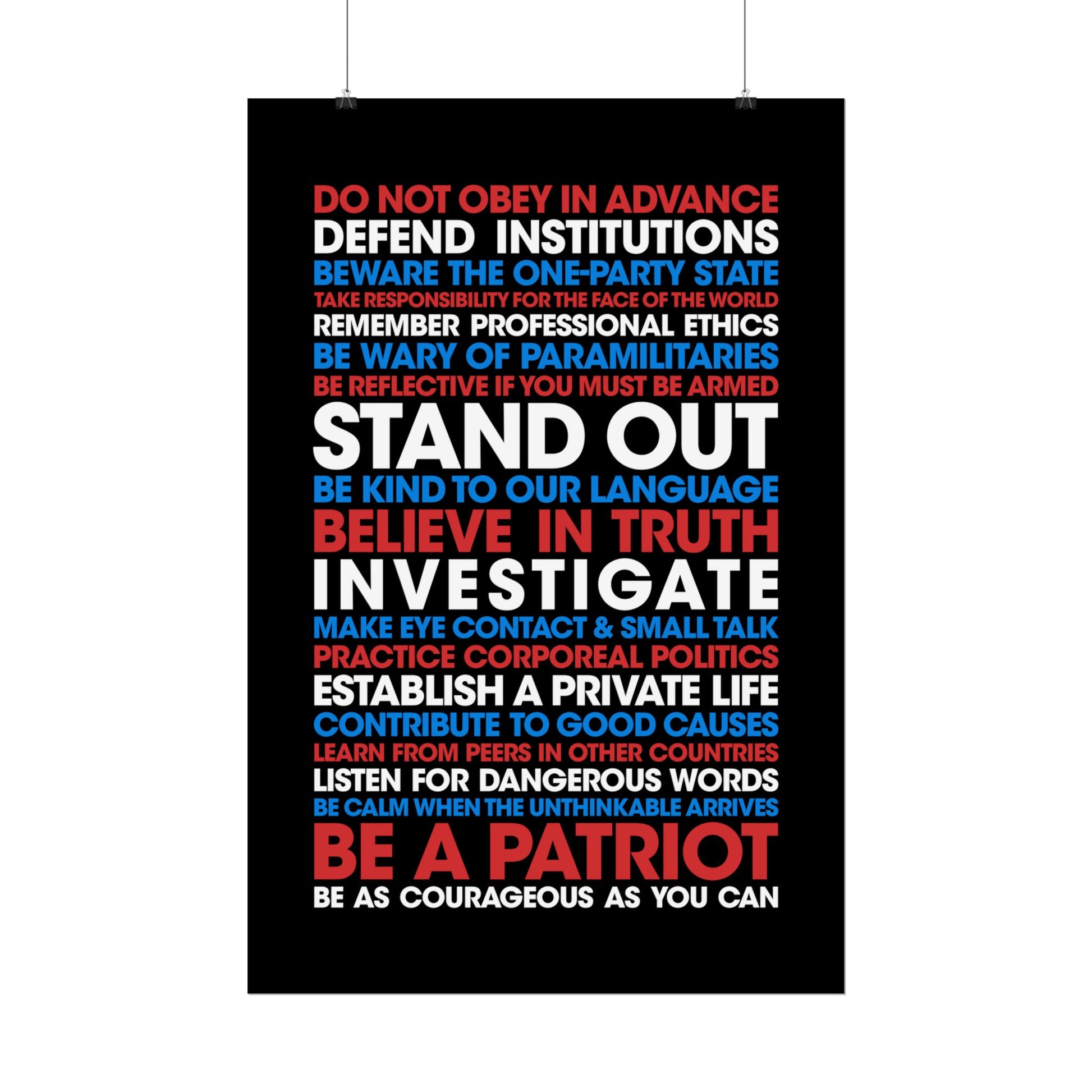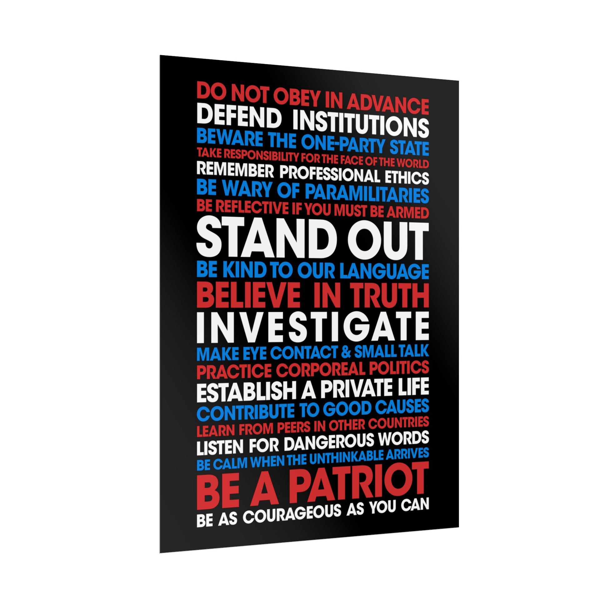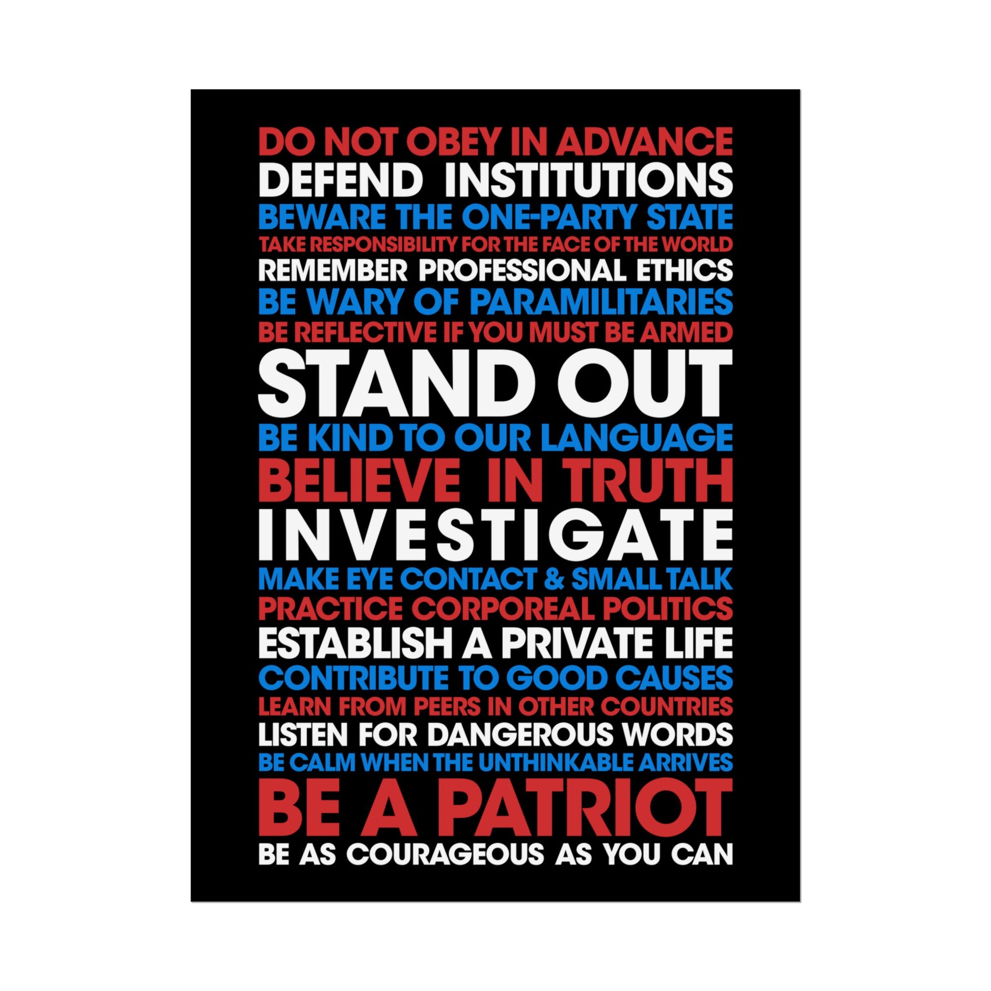 A poster adaptation of the lessons from "On Tyranny: Twenty Lessons from the Twentieth Century" by Timothy Snyder. These ideas are more vital and necessary than ever, and this poster will help broadcast the core concepts anywhere you see fit.
