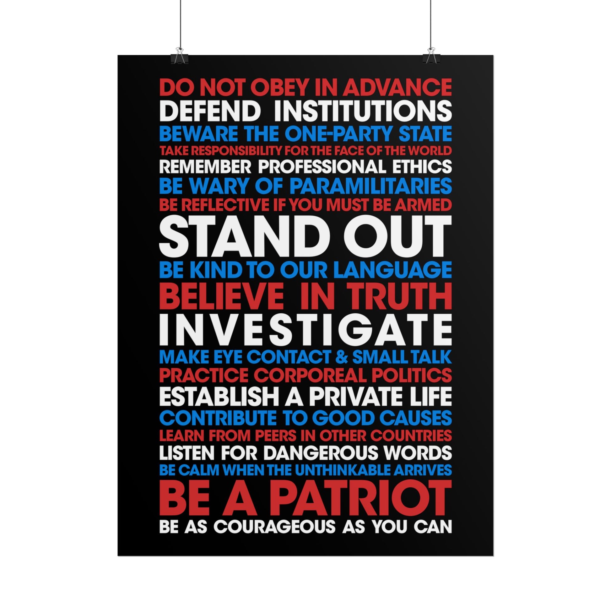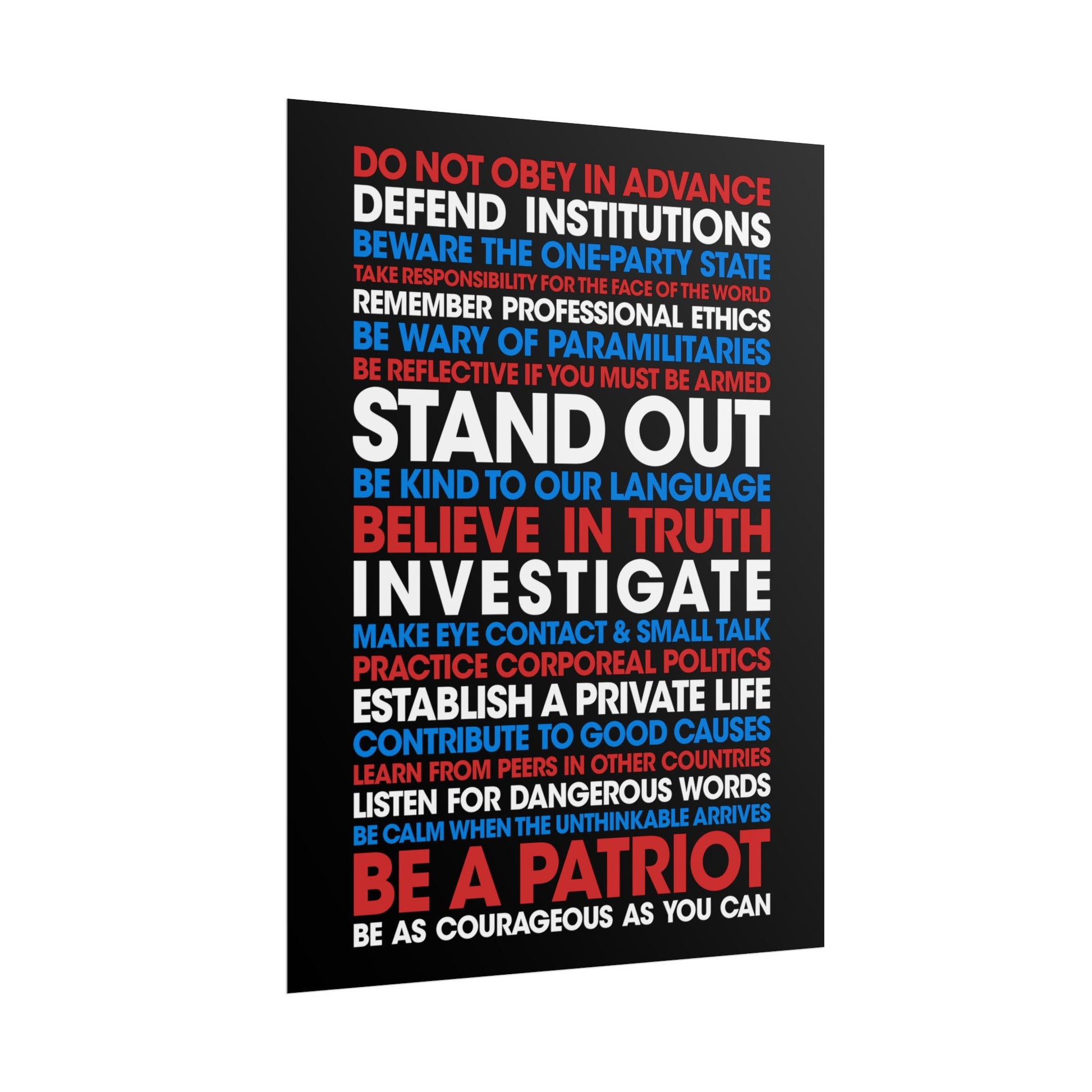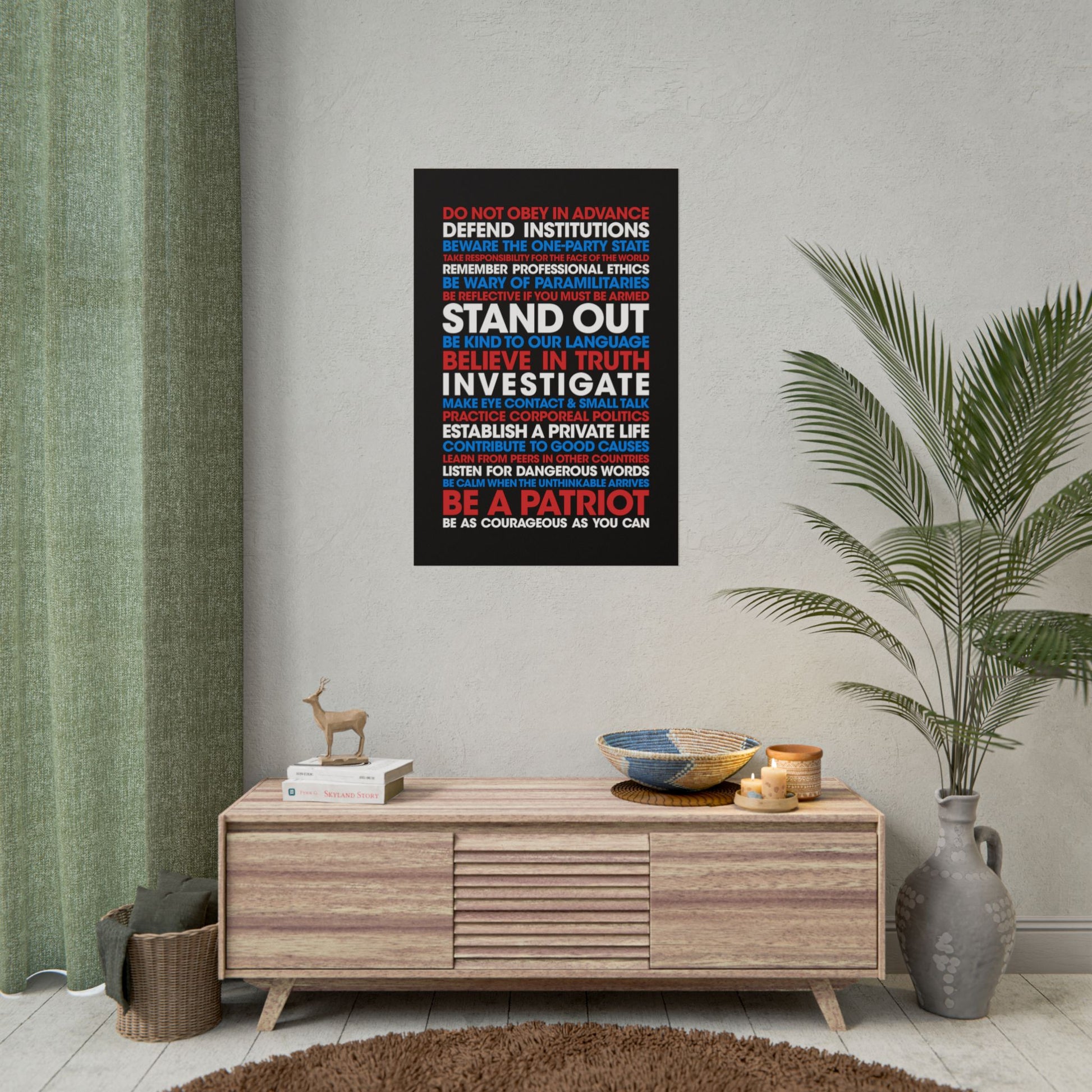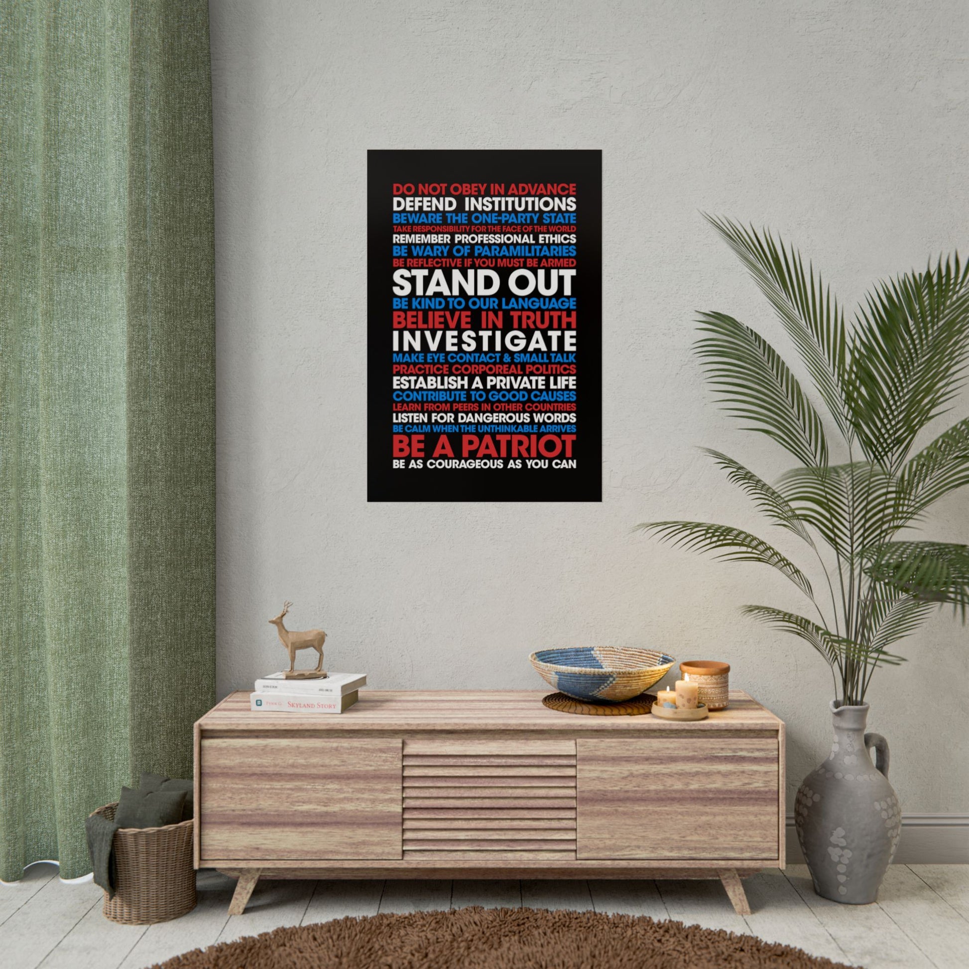 A poster adaptation of the lessons from "On Tyranny: Twenty Lessons from the Twentieth Century" by Timothy Snyder. These ideas are more vital and necessary than ever, and this poster will help broadcast the core concepts anywhere you see fit.